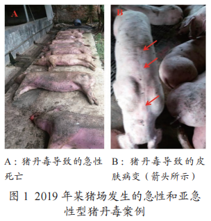 發(fā)病豬只往往伴隨有四肢關節(jié)的疼痛,不愿站立,驅(qū)趕后表現(xiàn)憤怒,伴有尖叫,走路僵硬,如踩高蹺狀等癥狀。多數(shù)發(fā)病豬只會出現(xiàn)食欲下降,部分或完全廢絕,如果發(fā)病時剛好處于母豬的懷孕期則還可以出現(xiàn)流產(chǎn)、死胎增加等繁殖障礙問題。特征性的皮膚病變被稱為“大紅袍”、“小紅袍”、“打火印”、“鉆石樣皮膚病變”,可以作為初步診斷的依據(jù)(容易與慢性非洲豬瘟混淆),感染后的第2天皮膚病變就開始發(fā)生,到第3天仔細觀察時可以發(fā)現(xiàn)皮膚上出現(xiàn)小的、粉紅色和黑褐色丘疹塊,單塊皮膚病變一般呈方形或菱形(圖1B),注意杜洛克、皮特蘭等皮膚顏色較深的豬發(fā)病后需要通過觸診確定。皮膚病變的嚴重程度常常指示著發(fā)病的愈后,顏色越深愈后越差,粉紅到淺紫色皮膚病變對應急性非死亡發(fā)?。欢谧仙つw病變則暗示發(fā)病豬只即將死亡或以死亡終結。