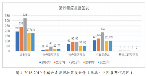 從收集整理的數(shù)據(jù)來看,國內(nèi)商品化的豬丹毒疫苗品種有4種,豬丹毒滅活、豬丹毒活苗、豬丹毒-豬肺疫-豬瘟三聯(lián)活疫苗和豬丹毒-豬肺疫二聯(lián)滅活疫苗,疫苗的使用大大降低了豬丹毒病的發(fā)生率,特別是三聯(lián)活疫苗在一定時期給我國豬瘟-豬肺疫-豬丹毒的聯(lián)合防控發(fā)揮了非常重要的作用。截止2020年,共有21家生產(chǎn)企業(yè)獲得豬丹毒疫苗的生產(chǎn)批文,從2016-2020年批簽發(fā)數(shù)據(jù)可以看出,三聯(lián)活疫苗的使用量最大,其次為活疫苗單苗和滅活疫苗(圖4)。然而,一些學者認為豬瘟-豬肺疫-豬丹毒三聯(lián)疫苗,由于存在著3種不同病原成分,相比活疫苗單苗會存在更高的安全隱患特別是在母豬、個體弱、發(fā)病的豬免疫時可能會導致嚴重的副反應,其次隱性感染豬只接種弱毒疫苗時還有引起疾病暴發(fā)的風險。