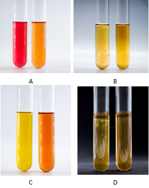 圖C:支原體肉湯培養(yǎng)結(jié)果,左邊黃色為陽性,右邊橙色為陰性;