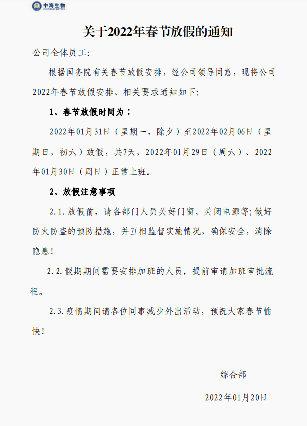 根據(jù)國務(wù)院有關(guān)春節(jié)放假安排,經(jīng)公司領(lǐng)導(dǎo)同意,現(xiàn)將公司2022年春節(jié)放假安排、相關(guān)要求通知如下: